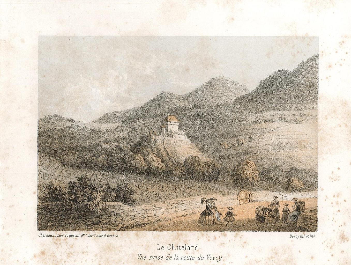 Veduta, antica ed originale, stampata a colori del Chatelard sulla strada per Vevey. Autore: Deroy lith. Luogo: Chatelard - Vevey. Anno: 1840 ca. Tecnica: litografia. Dimensioni: 100x135. Leggero foxing