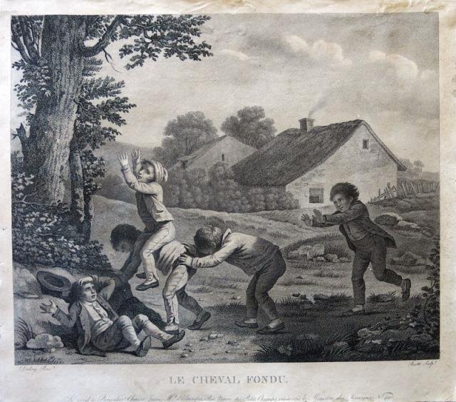 Paris, 1830 circa. Incisione in rame all'acquaforte in pointellisme, b/n, cm 30,5 x 34,5 (il foglio). Da un dipinto del Droling, piacevole soggetto decorativo con figure di bambini impegnati nel gioco del “cavallo fuso”. Difetti marginali della carta e piccole macchioline di umido, buona l'impressione e l'inciso.