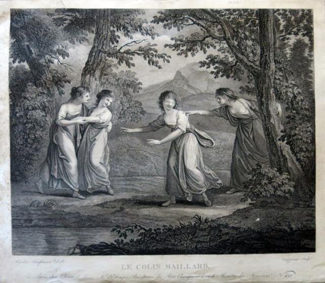 Paris, 1830 circa. Incisione in rame all'acquaforte in pointellisme, b/n, cm 30 x 34,5 (il foglio). Da un dipinto della Kauffmann, piacevole soggetto decorativo con figure di fanciulle impegnate nel gioco della "mosca cieca". Difetti marginali della carta e piccole macchioline di umido, buona l'impressione e l'inciso.