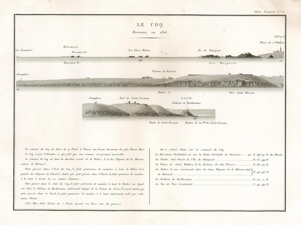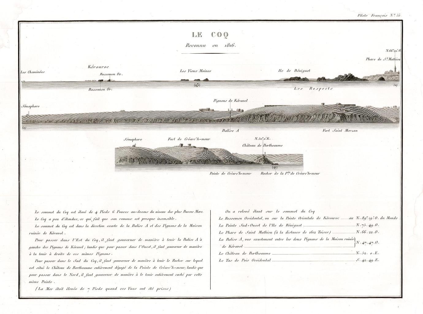 Incisione, antica ed originale, raffigurante le coste del nord-ovest della Francia nel litorale della Bretagna nei pressi di Brest in particolare: Phare de St. Mathieu, Chateau de Bertheaume. Inserita nell’opera di Beautemps Beaupré Charles François (considerato il padre della idrografia moderna) “Pilote français, (environs de Brest) / Rédigé / Par M. Beautemps Beaupré Ingénieur Hydrographe en Chef de la Marine, / Membre de l’Académie Royale des Sciences de l’Institut de France… / Publié par ordre du Roi / Sous me Ministère de Son Excellence M.le Marquis de Clermont Tonnerre /.“ Edita a [Parigi]. Lievi difetti