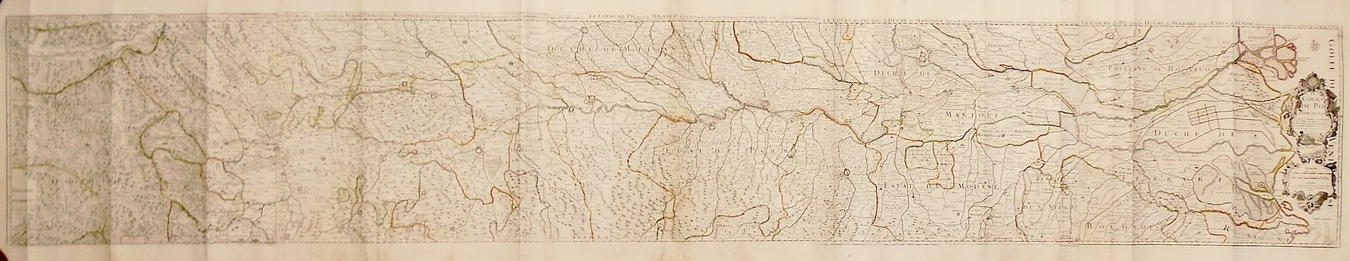 incisione in rame in cinque lastre, ognuna circa mm 400x490 (misura totale mm 400x 2450), incise da Charles Amadeus de Berey, come riportato in lastra su più fogli "gravé par Berey" ed al centro in basso nel primo foglio " A Paris chez Berey graveur rue St. Jacques devant la fontaine St. Severin a la Princesse de Savoye" <BR>La più lunga carta del Po mai pubblicata e la prima che raffigura in effetti il solo corso del fiume, senza allargarsi ai territori adiacenti. Ogni foglio con proprio titolo in alto: "La source du Po et les passages de France en Piemont", "Le cours du Po dans le Piemont et le Monferrat", "Le cours du Po dans le Milanez", "Le cours du Po dans le Duché de Mantoue", "Le cours du Po dans le Duché de Ferrare et les Etats de Venise". Secondo stato pubblicato nel 1734.<BR>Ottimo esemplare a fogli uniti con buoni margini. <BR>Terre di Langobardia, La "Lombardia", il corso del Po e il Ducato Estense nell'antica cartografia a stampa 1520-1796, n. 86; Arrigoni Bertarelli, 616 (ediz. 1734) <BR>