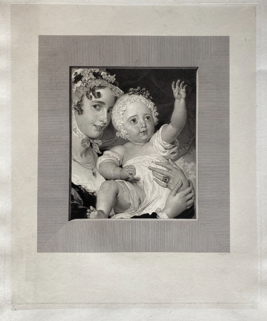 La stampa è tratta da un dipinto di Thomas Lawrence (Bristol 1768 - Londra 1830) raffigurante il ritratto di Priscilla Anne Fane contessa di Westmorland (1793 – 18 febbraio 1879), conosciuta come Lady Burghersh, ritratta con il figlio George Fane. All'interno di una cornice quadrata realizzata mediante la successione di linee parallele che creano un impattante effetto ottico vediamo, quasi affacciarsi, le due figure. La donna è colta di profilo, di tre quarti, ha il volto diretto verso la spettatore e sorride al suo sguardo. Ricci composti escono da una cuffia con decorazione floreale e una scintillante collana pende sul suo collo. Stringe tra le braccia suo figlio George, paffuto e rappresentato a figura intera con un braccio sollevato come in un saluto. Forti contrasti chiaroscurali esaltano la lucentezza dell'incarnato, degli abiti e avvolgono la scena in una luce grigio-argentea colma di amore materno. Sullo sfondo una tenda drappeggiata lascia lo spazio ad una piccola porzione di cielo solcato da nubi. In basso oltre la cornice inciso Longhi sc e al centro timbro a secco con le iniziali dell'autore GL.