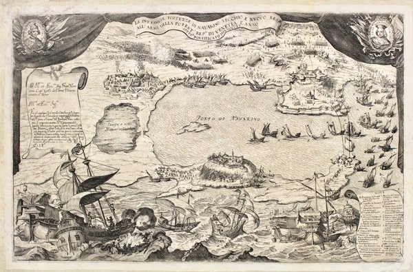 Incisione in rame, mm 430x675. Tracce di antico montaggio su tela, qualche vecchio rinforzo al verso e piccoli forellini sporadici restaurati.<BR>Splendida scenografica stampa d'occasione, pubblicata singolarmente, ma nell'ambito di una serie sulle battaglie contro i turchi; celebra la grande vittoria navale veneziana contro l'Impero Ottomano, battaglia svoltasi nel contesto della guerra Austro-Turca combattuta dalla Lega Santa fra il 1684 e il 1699 con cui la Serenissima contese la Morea ai Turchi. Il 4 giugno 1686 il veneziano Francesco Morosini che al comando di un gruppo di spedizione cristiano aveva occupato il giorno prima Navarino Vecchio, impegna violenta battaglia contro i turchi a Navarino Nuovo e uscito vittorioso si impossessa di quell' importante porto. La guerra di Morea fu l'ultima grande campagna espansionistica della Serenissima e si concluse con la pace di Carlowitz nel 1699, che sancì la vittoria della Lega Santa e, tra l'altro, la cessione della Morea ai Veneziani. Apparentemente molto rara, siamo riusciti a localizzare solo una copia presso il museo nazionale istorico di Atene ed una presso la Australian Library, oltre ad una copia mutila in pessime condizioni in una vendita in asta. <BR>