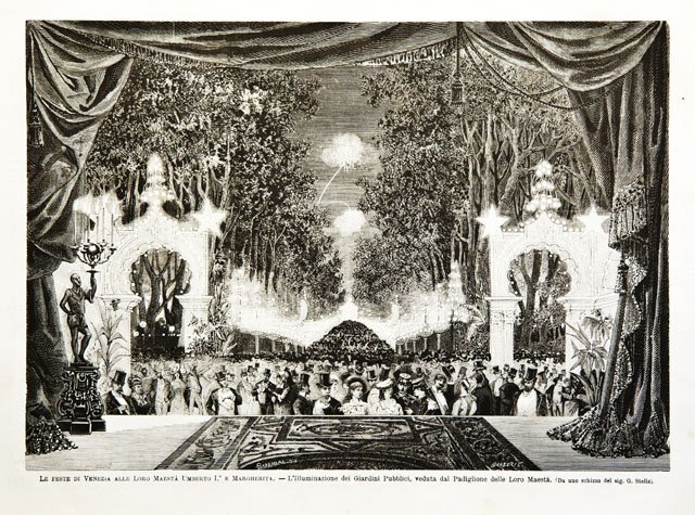 Le feste di Venezia alle Loro Maestà Umberto I° e Margherita.- L’Illuminazione dei Giardini Pubblici, veduta dal Padiglione delle Loro Maestà