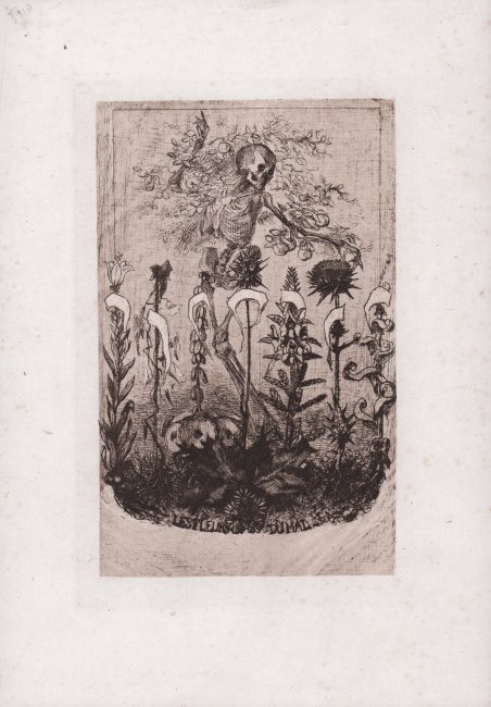 Frontespizio inedito per "Les Fleurs du Mal" di Baudelaire: uno scheletro in piedi davanti a sette fiori che rappresentano i sette peccati capitali; le braccia si protendono verso l'esterno, avvolte da frutti su rami; in basso al centro il titolo della pubblicazione: "LES FLEURS DU MAL". Acquaforte, 1860 circa, impressa su carta vergata coeva, con margini, in perfetto stato di conservazione. Esemplare nel primo stato descritto da Beraldi. ' Il libro poetico più importante del secondo Ottocento nacque come suite di diciotto poesie apparse sulla «Revue des deux mondes» X, 2, maggio-giugno 1855. Due anni dopo, nel 1857, la prima edizione in volume della raccolta, contenente centosei poesie, subisce un processo dal quale escono condannati il poeta e l’editore, costretti tra le altre cose a censurare sei poesie. Passati tre anni, è la volta dell’edizione definitiva; il contratto tra gli editori e il poeta, firmato il 30 dicembre 1856, prevedeva una tiratura di 1.000 esemplari e fissava il compenso per l’autore in 25 centesimi per ogni volume stampato, anche se invenduto. Il numero di mille esemplari non venne rispettato; in una nota scritta a mano sulla sua copia, il poeta indicava la tiratura di milletrecento volumi, ma probabilmente se ne stamparono solo millecento su vélin d’ Angouleme, oltre a venti su carta vergata d’ Olanda. Il poeta aveva espresso di collocare in antiporta un disegno allegorico. L’ incarico era stato affidato al ' graveur ' Félix Bracquemond che aveva già lavorato per l’editore. Secondo il desiderio del poeta l’immagine doveva rappresentare uno scheletro arboreo radicato in terra e circondato da ‘fiori del male’. Nessuna delle prove eseguite dall’ artista incontra l’approvazione di Baudelaire, il progetto viene abbandonato e il disegno sostituito con un ritratto dell’autore. Bracquemond dovette dunque rinunciare al suo progetto e limitarsi a incidere un ritratto di Baudelaire, che diventerà poi una delle sue immagini più famose e iconiche. ' Magnifica prova di questa rara incisione. Bibliografia Beraldi 1885-92 / Les Graveurs du dix-neuvième siècle (378.I); IFF / Inventaire du Fonds Français: Bibliothèque Nationale, Département des Estampes (110). Unpublished frontispiece for 'Les Fleurs du Mal' by Baudelaire (1857): a skeleton standing before seven flowers representing the seven deadly sins; his arms extend outwards, enveloped with fruits on branches; the title of the publication at bottom centre. Etching, 1860 circa, lettered within image at bottom centre: 'LES FLEURS DU MAL'. A fine impression on contemporary laid paper, with margins, perfect condition. Example in the first state described by Beraldi. ' The most important poetic book of the second half of the 19th century originated as a suite of eighteen poems that appeared in the "Revue des deux mondes" X, 2, May-June 1855. Two years later, in 1857, the first volume edition of the collection, containing one hundred and six poems, underwent a trial from which the poet and publisher emerged convicted, forced, among other things, to censor six poems. Three years passed, and it was the turn of the final edition; the contract between the publishers and the poet, signed on December 30, 1856, provided for an isseu of 1,000 examples and set the author's compensation at 25 cents for each volume printed, even if unsold. The number of 1,000 examples was not adhered to; in a handwritten note on his copy, the poet indicated a print run of 1,300 volumes, but probably only 1,300 were printed on vélin d' Angouleme, as well as twenty on vélin d' Holland. The poet had expressed that he would place an allegorical drawing on the frontispiece. The assignment was given to graveur Félix Bracquemond who had already worked for the publisher. According to the poet's wish, the image was to represent an arboreal skeleton rooted in the earth and surrounded by 'flowers of evil.' None of the proofs executed by the 'artist met with Baudelaire's approval, the project was abandoned, and the drawing replaced with a portrait of the author. Bracquemond therefore had to give up his project and limit himself to engraving a portrait of Baudelaire, which would later become one of his most famous and iconic images. Magnificent proof of this rare work. Bibliografia Beraldi 1885-92 / Les Graveurs du dix-neuvième siècle (378.I); IFF / Inventaire du Fonds Français: Bibliothèque Nationale, Département des Estampes (110). Cfr.