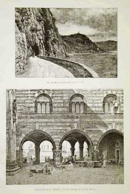 Due vedute di luoghi caratteristici del lago : Le gallerie di Varenna ed il particolare dei portici del "Broletto" a Como. Testo al verso.
