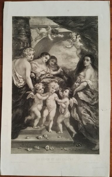 Bellissima incisione ottocentesca. Buone condizioni con leggeri strappi nella parte inferiore centrale e nella parte centrale destra. Rappresentazione del Genio e delle Grazie. 33 cm x 54 cm.