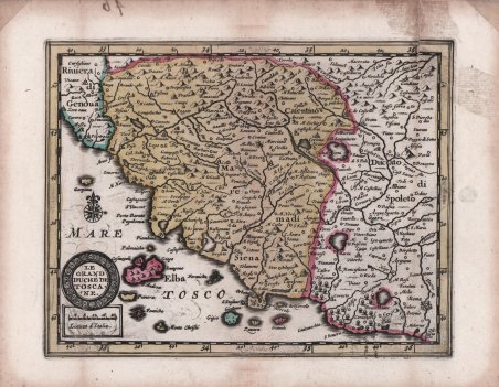 Rarissima mappa tratta dal "Nouveau Petit Atlas - Atlas soluagé de son gros pesant Fardeau" stampato a Leida, nel circa 1714. L’atlante è incredibilmente raro e solo una copia completa è conosciuta nella biblioteca di Leida, mentre Burden possiede solo il primo volume. è composto di nove parti: una parte generale denominata “Nouveau Petit Atlas” e 8 parti con mappe regionali intitolate “Atlas Soulage de son gros e pesant Fardeau”. Quasi tutte le mappe vengono stampate utilizzando e rielaborando le lastre di Janssonius per il suo “Atlas Minor”, atlante di ispirazione mercatoriana che prima Jodocus Hondius jr. e Pieter Kaerius, ' poi Johannes Janssonius ampliarono e aggiornarono. I titoli e la scala sono stati tradotti in francese. I cartigli sono stati modernizzati, con una forma tonda od ovale composta e delle rose dei venti aggiunte. Alcuni toponimi sono aggiunti, come si nota dalla diversa grafia incisa. Le carte dell’Italia provengono dall’ottava ed ultima parte dell’atlante, denominata “L’Atlas Soulagé de son gros & pesant fardeu: Ou ' NOUVELLES CARTES GEOGRAPHIQUES ' qui contiennent ' l’ITALIE, ' avec le Paryies principales qui la composent comme l’Etat del L’eglise, Naples, Sicile, &c. Ouvage propre pour Vouager commodement & agréablement des Yeux”. Acquaforte, con coloritura coeva, strappo restaurato in alto a destra, per il resto in ottime condizioni. Grandissima rarità cartografica. Very rare map from the "Nouveau Petit Atlas - Atlas soluagé de son gros pesant Fardeau" printed in Leiden, circa 1714. The atlas is incredibly rare and only one complete copy is known in the Leiden library, while Burden owns only the first volume. it consists of nine parts: a general part called "Nouveau Petit Atlas" and 8 parts with regional maps entitled "Atlas Soulage de son gros e pesant Fardeau". Almost all of the maps are printed using and reworking Janssonius' plates for his "Atlas Minor", a Mercatorian-inspired atlas that first Jodocus Hondius Jr. and Pieter Kaerius, then Johannes Janssonius expanded and updated. The titles and scale have been translated into French. The cartouches were modernized, with a compound round or oval shape and wind roses added. Some place names are added, as noted by the different engraved spelling. The maps of Italy come from the eighth and last part of the atlas, called "L'Atlas Soulagé de son gros & pesant fardeu: Ou NOUVELLES CARTES GEOGRAPHIQUES qui contiennent l'ITALIE, avec le Paryies principales qui la composent comme l'Etat del L'eglise, Naples, Sicile, &c. Ouvage propre pour Vouager commodement & agréablement des Yeux". Etching, with contemporary coloring, in very good condition. A cartographic rarity. Cfr.
