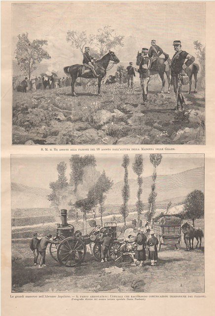 Le grandi manovre nell'Abruzzo Aquilano - Il parco aerostatico: Ufficiali che raccolgono comunicazioni telefoniche dal pallone - S. M. il Re assiste alla fazione del 28 agosto dall’altura della Madonna delle Grazie