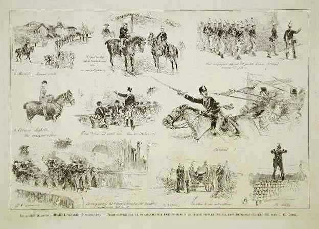 Rappresentazione, in varie vignette, dei primi scontri tra la Cavalleria e le truppe. Testo al verso.