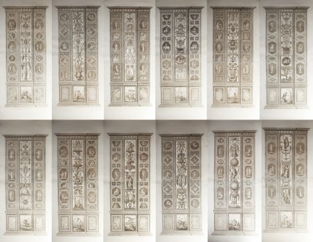 Serie completa di 12 incisioni all’acquaforte, 1774/6, firmate e datate in lastra in basso a destra. Magnifiche prove, impresse su carta vergata coeva con filigrana “scudo con giglio” (ove presente), con ampli margini, carta con barbe, in eccellente stato di conservazione. La famosa serie delle Logge di Raffaello che reca i nomi di Giovanni Volpato e Giovanni Ottaviani, datata 1772/6 ebbe una gestazione lunga e travagliata, giustificata dall’enorme mole di lavoro. La serie, a cui il Volpato deve gran parte della sua notorietà nell’ambiente romano del tempo, è la prima opera che affronta, in modo dettagliato e completo, la riproduzione degli ornati dei pilastri delle Logge affrescate da Raffaello. Uscirono in tre volumi tra il 1772 ed il 1776, frutto della collaborazione del pittore Gaetano Savorelli, dell’architetto Pietro Camporesi e dell’incisore Giovanni Ottaviani per la prima parte, cui dal 1772 si aggiunsero Ludovico Teseo e il Volpato, che firmarono le tavole della terza parte, raffigurante i pilastri. L’intervento di Volpato, che assunse in certo senso la direzione dell’opera legando il suo nome all’impresa, costituisce il motivo del suo trasferimento a Roma, probabilmente chiamato da Clemente XIV (1769-1774). Le tavole del Volpato, incise tra il 1774 ed il 1776 con la collaborazione del Teseo che si occupava dei rilievi, riproducono con grande libertà traduttiva i dodici contropilastri della Loggia. La scarsa visibilità della parte inferiore dell’affresco spinse l’artista ad applicare integrazioni di fantasia, come nel caso di alcuni pilastri dove sono inseriti elementi decorativi desunti dalle bordure di alcuni arazzi vaticani. Ciò non impedì tuttavia le vasta ed immediata risonanza che ebbe la raccolta, che costituì un importante repertorio figurativo da cui attingere motivi di decorazione, contribuendo al grande successo dei temi grotteschi del periodo neoclassico. Sono note delle prove con coloritura coeva; le prove destinate alla coloritura sono stampate con inchiostro marrone/bistro dai toni più delicati, come queste che presentiamo, e sono assolutamente più rare. Magnifico set, omogeneo, in eccellente stato di conservazione. A complete series of 12 etchings, 1774/6, signed and dated at lower right. Magnificent works, printed on contemporary laid paper with “shield with lily” watermark (if present), with wide margins, untrimmed, in excellent condition. The famous series of the Logge of Raphael, bearing the names of Giovanni Volpato and Giovanni Ottaviani, has been realized between 1772 and 1776; the process of realization was quite long, due to the proportion of the work. This series, which made Volpato quite famous in the Roman artistic environment of his time, is the first work that represents, minutely and completely, the pillars decorations of the Loggias painted by Raphael. Three volumes were published between 1772 and 1776, as the result of the cooperation of the painter Gaetano Savorelli, the architect Pietro Camporesi and the engraver Giovanni Ottaviani for the first part; in 1772 Ludovico Teseo and Volpato joined them and signed the plates of the third part, the one depicting the pillars. To work on this series, Volpato, who became in a way the project manager, moved to Rome, very likely upon pope Clement XIV request (1769-1774). Volpato’s plates, engraved between 1774 and 1776 together with Teseo who worked on the relieves, represent quite freely the twelve counter pillars of the Loggia. The scarce visibility of the lower part of the fresco brought the artist to integrate the missing parts with fictitious elements, as in the decorations of some pillars taken from the tapestries in the Vatican. Nevertheless, this did not affect the immediate and huge echo the collection had, for it represented an important figurative repertoire from which many other artists could draw inspiration and it gave a remarkable contribution to the circulation of the grotesque themes of the Neoclassical period. A few print proofs with contemporary colour are known; they have been printed with a more delicate brown/bister ink, like the ones we present hereby, and are far more rare. Beautyful set, in excellent condition. Cfr. Giorgio Marini, Volpato, pp. 187/198; Pezzini in "Raphael Invenit" pp. 105/6, 36/45. Dimensioni 480x1060 ognuna.