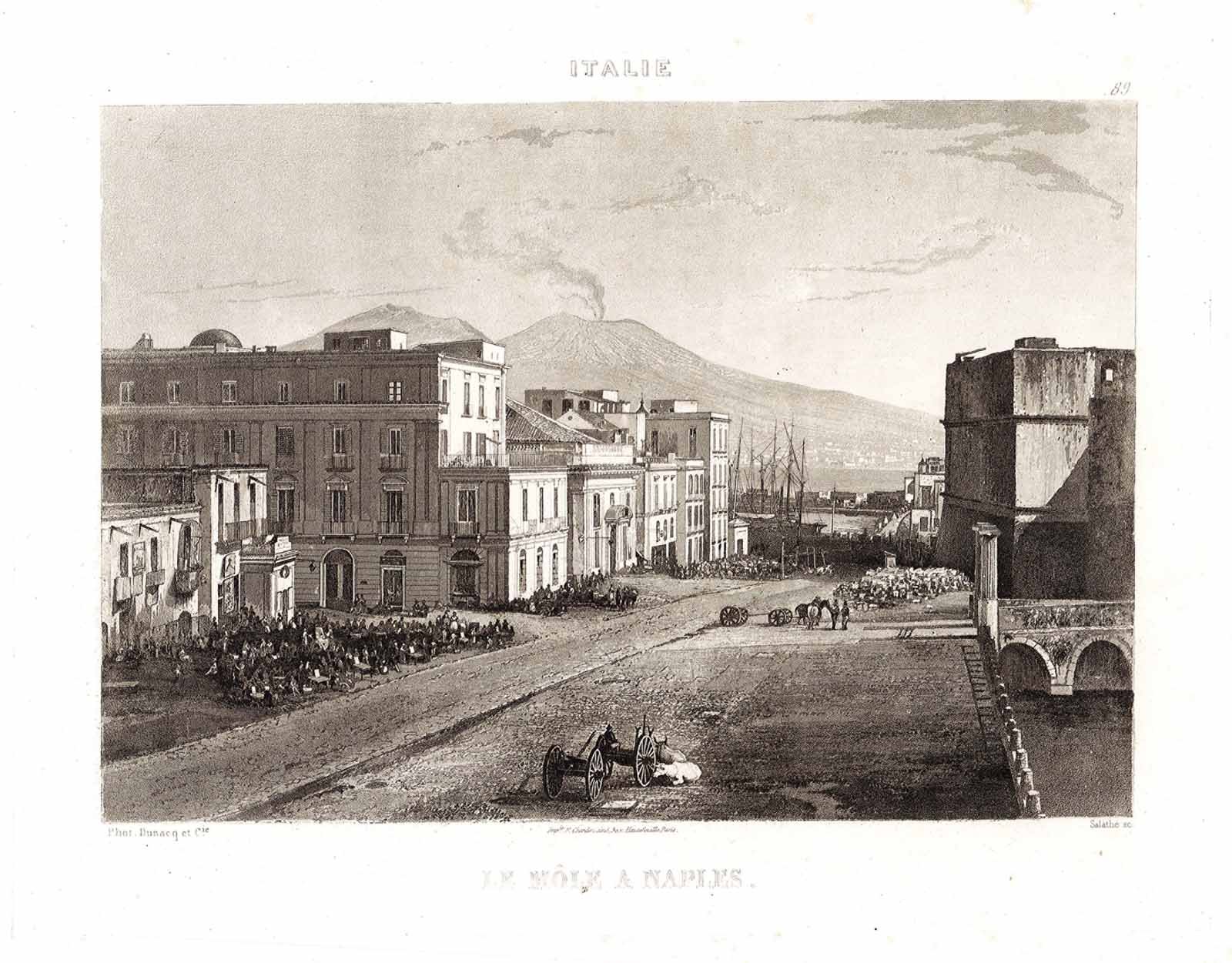 Stampa, antica ed originale, con veduta del Lungo mare di Napoli. Inserita nell'opera "Excursions photographiques. Vues et monuments les plus remarquables de l'univers.". Parigi 1863. Autore: Salathé sculp. Luogo: Napoli. Anno: 1863. Tecnica: acquatinta. Dimensioni: 270x370 il foglio.