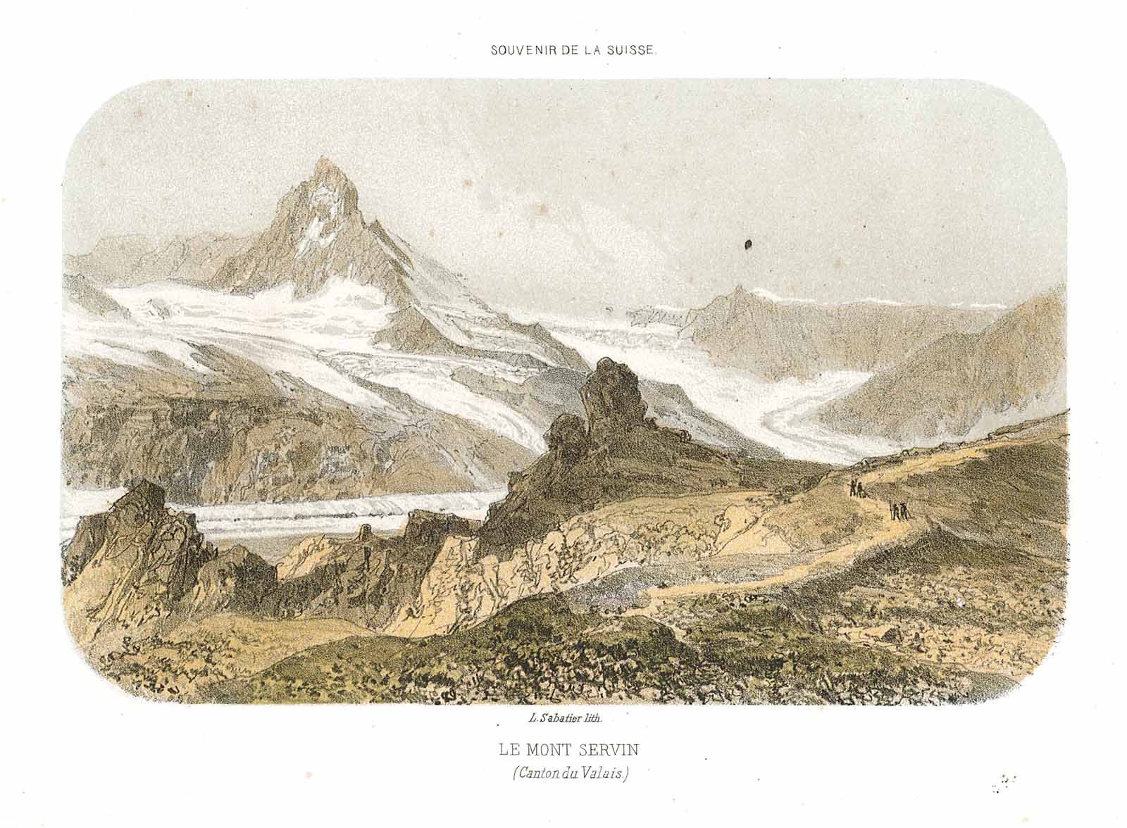 Rara veduta del Cervino in cui è ben visibile di fianco al Riffelhorn, la strada mulattiera sotto il Gornergrat. Ottimo lo stato di conservazione. Rif: Aliprandi - Gattlen 1978: p. 51