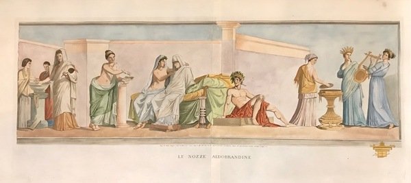 Incisione originale su rame su due fogli uniti (cm. 81x34,3 più ampi margini bianchi). Raffinata coloritura all’acquarello. Prima rara riproduzione a stampa del celebre affresco: il dipinto, rinvenuto a Roma nel 1601 durante una ricerca antiquaria e conservato presso l’omonima sala della Biblioteca Apostolica Vaticana, rappresenta una scena di matrimonio con la partecipazione di Imene e Venere. A lungo ritenuta copia di un originale ellenistico, è invece un prodotto originale della pittura romana di età augustea (I Secolo a.C.).