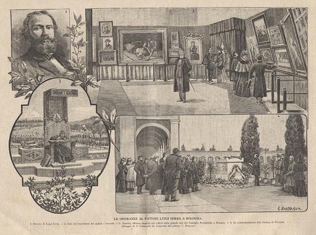 Composizione di quattro vignette: 1. Ritratto di Luigi Serra - 2. Sala dell’esposizione dei quadri e bozzetti - 3. Irnerio, affresco eseguito nel soffitto della grande sala del Consiglio Provinciale a Bologna - 4. La commemorazione alla Certosa di Bologna. Testo al retro