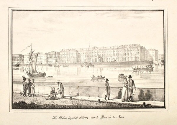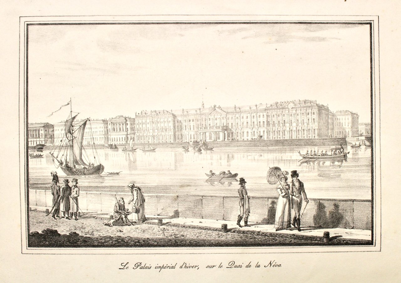 Litografia, mm 225x345. Bella veduta lungo la Neva a San Pietroburgo, animata da barche e passanti. Tratta da una serie non identificata. Ottimo stato di conservazione.