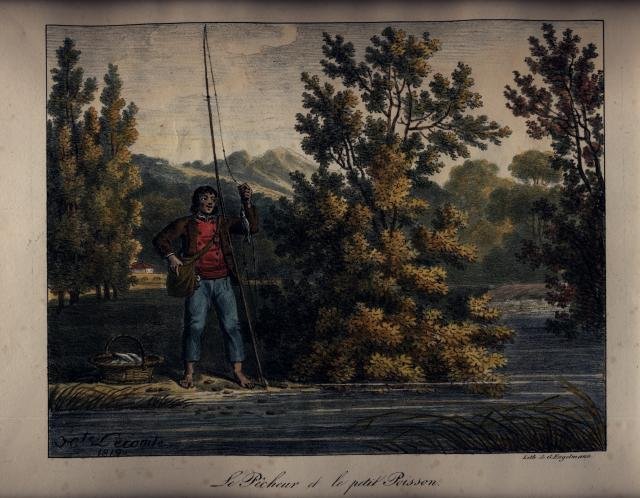 Paris, Lith. De Engelmann, 1819 (dipinto nel). Litografia stampata a colori e ritoccata di mano coeva, cm 19 x 24 (la parte raffigurata). Da un dipinto del Lecomte (firma e data nella scena), piacevole scenetta quadrata da filetto in nero: sulla riva di un fiume circondato da alberi, monti e collline, un giovanotto si rallegra del piccolo pesce preso con la lungha canna da pesca. Una piccola mancanza all' angolo superiore destro, piacevole coloritura e buona conservazione.