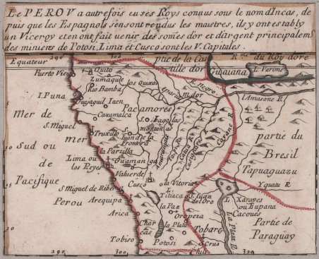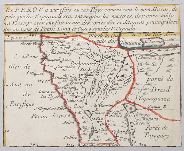 Acquaforte, 1656 circa, con coloritura coeva dei contorni, in buone condizioni.Esemplare del secondo stato di due, con l’imprint di Jacques Lagniet e la data del 1661.La mappa proviene dal rarissimo foglio intitolato “L’Amerique par P. Du Val Geographe du Roy”, dal quale è stato ritagliato all’epoca - come anche certificato dalle antiche iscrizioni a inchiostro su alcune delle mappe - venendo applicato su un supporto di carta contemporanea, a formare un piccolo atlante in-sedicesimo oblungo.Secondo Philip Burden, lo scopo di questa rara curiosità cartografica di Pierre Duval non è noto. Fa parte di un insieme di quattro tavole raffiguranti i continenti. Può essere datato, per motivi cartografici, all’incirca nel 1656. L’unico esemplare del primo stato del foglio dell’America noto all’autore proviene dalla John Evelyn Library. Il secondo stato del foglio reca l’imprint aggiuntivo di Jacques Lagniet e la data del 1661 (cfr. Burden, The Mapping of North America, pagg. 417-418, n. 322). Burden elenca solo 2 esemplari del secondo stato, in una collezione americana privata (The Glen McLaughlin Map Collection of California as Island, oggi conservata presso la Stanford University) e presso la Bibliotheque National de France (che possiede l’insieme dei quattro continenti).La raccolta di mappe americane di Pierre Duval è sia rara che insolita. Il foglio contiene 18 singole mappe di varie parti del Nord e del Sud America. La mappa generale in alto a sinistra è disegnata dalla mappa di formato in-folio dello stesso Duval (1655), che mostra l’isola della California, senza Grandi Laghi, e una grande massa denominata “Terre de Iesso” che si estende tra l’Asia e il Nord America.Ce ne sono otto dedicati al Nord America; quattro dei quali sono basati sulle mappe di Sanson del 1656 - Le Canada, La Nle. Espagne, Le N. Mexique e La Floride. Il confronto di Burden con le mappe di Sanson lo porta a credere che la mappa di Duval potrebbe aver preceduto la carta di Guadalajara di Sanson o forse essere stata pubblicata contemporaneamente, rendendo questa mappa del New Mexico effettivamente la prima dedicata all’isola della California. Le quattro piccole mappe lungo il centro della fila inferiore: La Virginie, La Nle. Holande, La Nle. Suede e Le Nouveau Danemarq sono estremamente interessanti perché ci sono poche mappe contemporanee dedicate a queste regioni. La mappa di New Holland mostra la parte inferiore del R. del Nort (fiume Hudson). La mappa della Nuova Svezia è la prima mappa a concentrarsi sul fiume Delaware. La mappa della Nuova Danimarca raffigura la regione artica rivendicata dalla Danimarca a nord-ovest della baia di Hudson, qui etichettata Mer Christiane.Le altre mappe sul foglio includono due dedicate alle Indie occidentali e sette mappe regionali del Sud America: La Guiane, La Castille d'Or, Le Perou, Le Bresil, Le Chili, Le Paraguay e La Magellanique. Etching, circa 1656, with contemporary outline colour, good condition.Example of the second state of two, with the imprint of Jacques Lagniet and the date 1661.The map comes from the very rare sheet entitled “L’Amerique par P. Du Val Geographe du Roy”, from which it was cut at the time and laid down on contemporary laid paper support, to form a small atlas, as certified by the ancient ink inscriptions on some of the maps.According with Philip Burden “The purpose of this rare curiosity by Pierre Duval is not known. It forms part of a set of the four known continents. It can be dated to apporximately 1656 […] The only example of the first state known to the author come from the John Evelyn Library in the early 1980s. The second state bears the additional imprint of Jacques Lagniet and the date 1661”. (cf. Burden, The Mapping of North America, pp. 417-418, n. 322). Burden list only 2 example of the second state, in a private American collection (The Glen McLaughlin Map Collection of California as an Island, at Stanford University) and at the Bibliotheque National de France (that own all the set of four continents).Pierre Duval's compilation of American maps is both rare and unusual. The sheet contains 18 individual maps of various parts of North and South America. The general map at top left is drawn from Duval's own folio map of 1655, which features the island of California, no Great Lakes, and a large Terre de Iesso stretching between Asia and North America.There are eight devoted to North America; four of which are based on Sanson's maps of 1656 - Le Canada, La Nle. Espagne, Le N. Mexique, and La Floride. Burden's comparison with Sanson's maps leads him to believe that Duval's map may have preceded Sanson's Audience de Guadalajara or possibly were published concurrently, making this map of New Mexico actually the first devoted to the island of California. Interestingly, on the small map the island is presented on the Foxe model, while on the general map it is shown on the Briggs format. The four small maps along the center of the bottom row - La Virginie, La Nle. Holande, La Nle. Suede, and Le Nouveau Danemarq are extremely interesting because there are few contemporary maps devoted to these regions. The map of New Holland features the lower part of the R. del Nort (Hudson River). The map of New Sweden is the first map to focus on the Delaware River. The map of New Denmark depicts the Arctic region claimed by Denmark to the northwest of Hudson Bay, here labeled Mer Christiane.The other maps on the sheet include two devoted to the West Indies, and seven regional maps of South America - La Guiane, La Castille d'Or, Le Perou, Le Bresil, Le Chili, Le Paraguay, and La Magellanique. Cfr. Burden, The Mapping of America, n. 322, II/II; Pastoureau (1984) p. 136; cf. Betz, The Mapping of Africa, pp. 294, 295, n. 85; cf. J. Hubbard, Japoniae Insulae. The Mapping of Japan, pp. 199-201, n. 28.