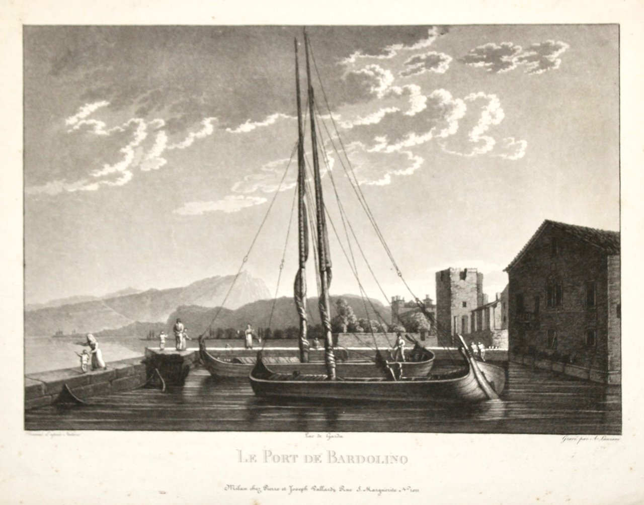 Incisione in rame all'acquatinta, su soggetto già inciso da Wetzel (Zurigo, 1824), Molto rara. Varie figure ravvivano il porto della località gardesana; in primo piano alcune imbarcazioni, a sfumare verso lo sfondo alcuni edifici e i monti. Ottimo esemplare rifilato alla battuta del rame. Non repertoriata in "Il Garda nelle stampe". <BR>