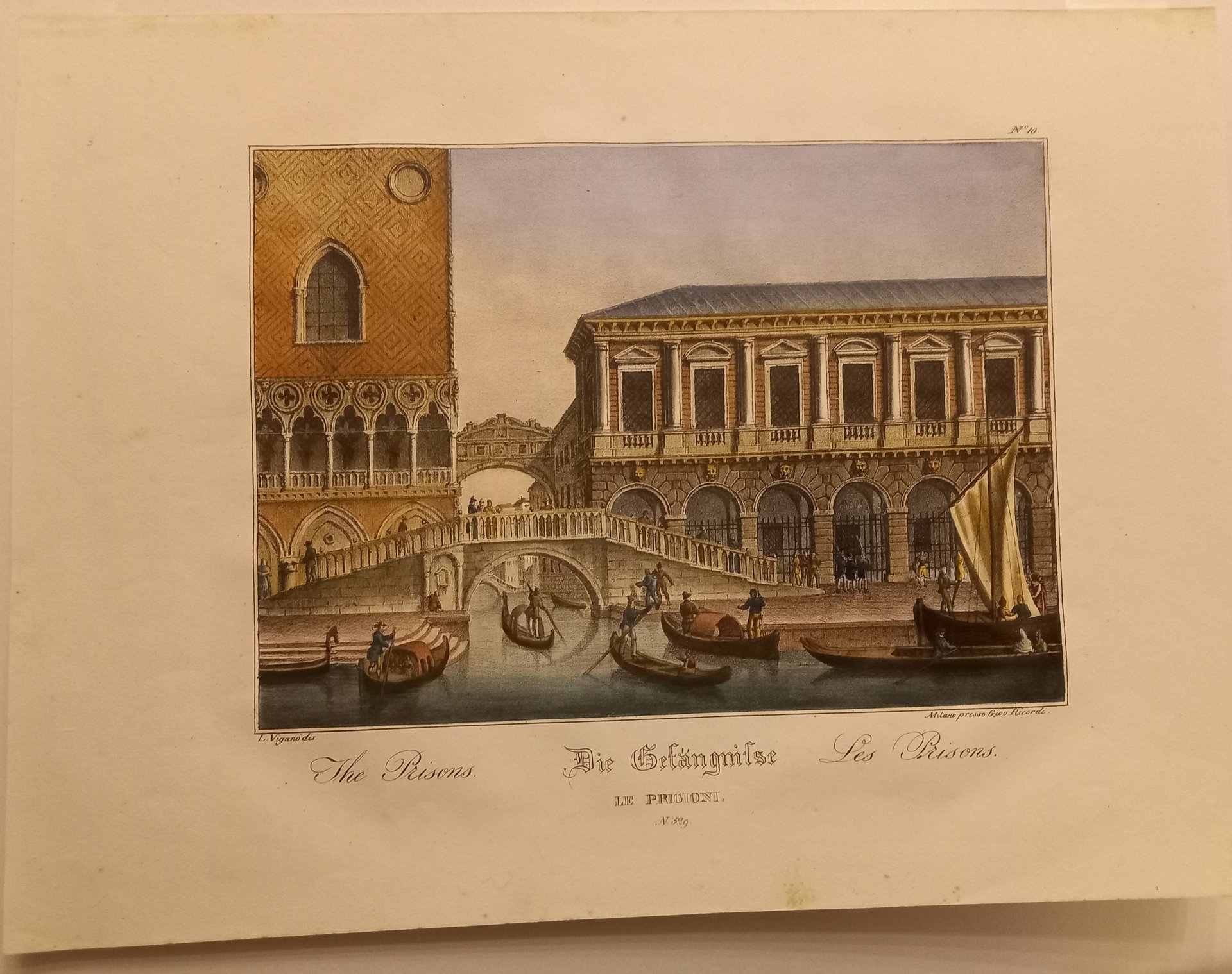 Litografia, 22,5 x 16 cm. Foglio 33 x 25 cm. Acquarellata. Fa parte dell'album: 24 vedute principali della città di Venezia. Milano: G. Cogliati, (183.?). In alto a destra il numero: N 10. Sotto l'immagine a sinistra L. Viganò dis., a destra Milano Lit. di Gio. Ricordi. Più in basso il titolo in quattro lingue. Viganò Luigi (1801-1864): incisore. Lithograph, 22.5 x 16 cm. Sheet 33 x 25cm. Watercolored. It is part of the album: 24 main views of the city of Venice. Milan: G. Cogliati, (183.?). At the top right the number: N 10. Below the image on the left L. Viganò drawing, on the right Milano Lit. by Gio. Ricordi. Below the title in four languages. Viganò Luigi (1801-1864): engraver.