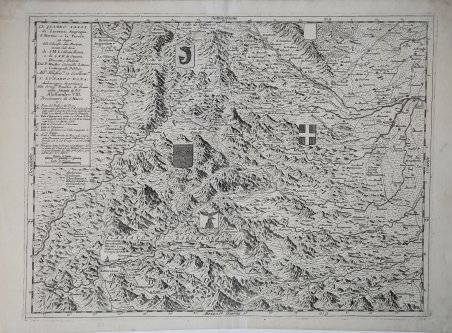 Dettagliata carta geografica raffigurante le Alpi Marittime tra Piemonte e Francia. Centrata sul Monviso e la sorgente del Po mostra le aree di Saluzzo e Pinerolo. ' Opera tratta dal ' Corso geografico universale, o sia la terra divisa nelle sue parti e subdistinta ne' suoi gran regni. Esposta in tavole geografiche ricorrette et accresciute di tutte le nuove scoperte, ad uso dell'Accademia Cosmografica degli Argonauti dal Padre Maestro Vincenzo Coronelli M. C. Cosmografo della Serenissima Republica di Venetia. Dedicata alla Santità di Nostro Signore Innocenzo XII. P. I. In Venetia, a spese dell'autore. MDCXCII. Coronelli visse un periodo di straordinaria fecondità editoriale a partire dal 1689, quando ebbe la cattedra di geografia presso l'Università alle Procuratie, con la pubblicazione, nel 1690, del primo volume dell'Atlante Veneto. In effetti sotto il nome di ' Atlante Veneto ' va tutta la raccolta di tredici opere composte nell'arco del decennio successivo, dall'Isolario ' allo ' Specchio del mare. In realtà solo alcune di tali opere possono definirsi atlante, e sono di valore molto disuguale, dato che si passa da opere originali e fondamentali come quelle citate o il ' Corso Geografico ' ad opere di compilazione o semplici raccolte di vedute. Il ' Corso Geografico ' uscì in diverse edizioni con numeri diversi di carte - sessantotto tavole nel 1689-92; di centosettantatré tavole nel 1692; duecentosessanta tavole, nel 1694-97 - che venivano vendute anche separatamente, al ritmo di sei carte al mese per due anni. Le carte furono incise tra il 1688 e il 1692 nell'attrezzatissima officina cartografica del convento dei Frari, dove lavoravano anche incisori stranieri. ' Incisione in rame, in ottimo stato di conservazione. Fine depiction of part of Alpine Northwestern Italy and contigous Alpine regions of France, published in Venice by Coronelli.The map provides a remarkable depiction of the mountains and valleys, showing roads, rivers, towns, mountain passes, etc. Includes a number of coats of arms of the various regions.Dedicated to Lunardo Dona, ambassador of the Venetian Republic. ' The map is taken from ' Corso geografico universale, o sia la terra divisa nelle sue parti e subdistinta ne' suoi gran regni. Esposta in tavole geografiche ricorrette et accresciute di tutte le nuove scoperte, ad uso dell'Accademia Cosmografica degli Argonauti dal Padre Maestro Vincenzo Coronelli M. C. Cosmografo della Serenissima Republica di Venetia. Dedicata alla Santità di Nostro Signore Innocenzo XII. P. I. In Venetia, a spese dell'autore. MDCXCII. Coronelli lived a period of extraordinary editorial fecundity starting from 1689, when he had the chair of geography at the University at the Procuratie, with the publication, in 1690, of the first volume of the ' Atlante Veneto. Under the name of ' Atlante Veneto ' goes the entire collection of thirteen works composed over the next decade, from the ' Isolario ' to the ' Specchio del mare. ' In reality, only some of these works can be defined as atlas, and are of very unequal value, since we go from original and fundamental works such as those mentioned or the ' Corso Geografico ' to works of compilation or simple collections of views. The ' Corso Geografico ' came out in several editions with different numbers of maps - sixty-eight maps in 1689-92; one hundred and seventy-three maps in 1692; two hundred and sixty maps in 1694-97 - which were also sold separately, at the rate of six a month for two years. The maps were alle engraved between 1688 and 1692 in the well-equipped cartographic workshop of the Frari convent, where foreign engravers also worked. ' Cfr.