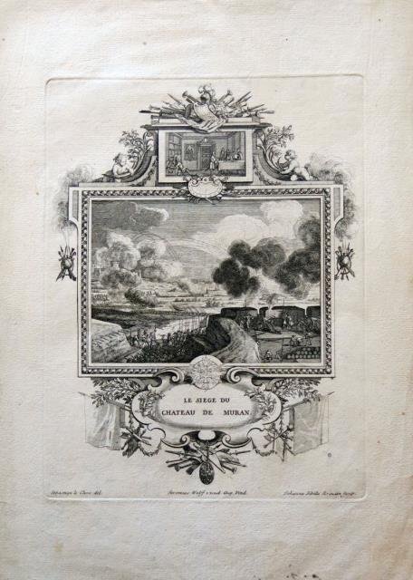Augusta, 1750 circa. Incisione in rame all’acquaforte e bulino, b/n, cm 16,8 x 22,2 (alla lastra) più margini. Da un disegno di Sebastian le Clerc, piacevole e decorativa incisione che illustra l’assedio del Castello della città di Murano, arricchita da ornamentale cartiglio. Buono stato.