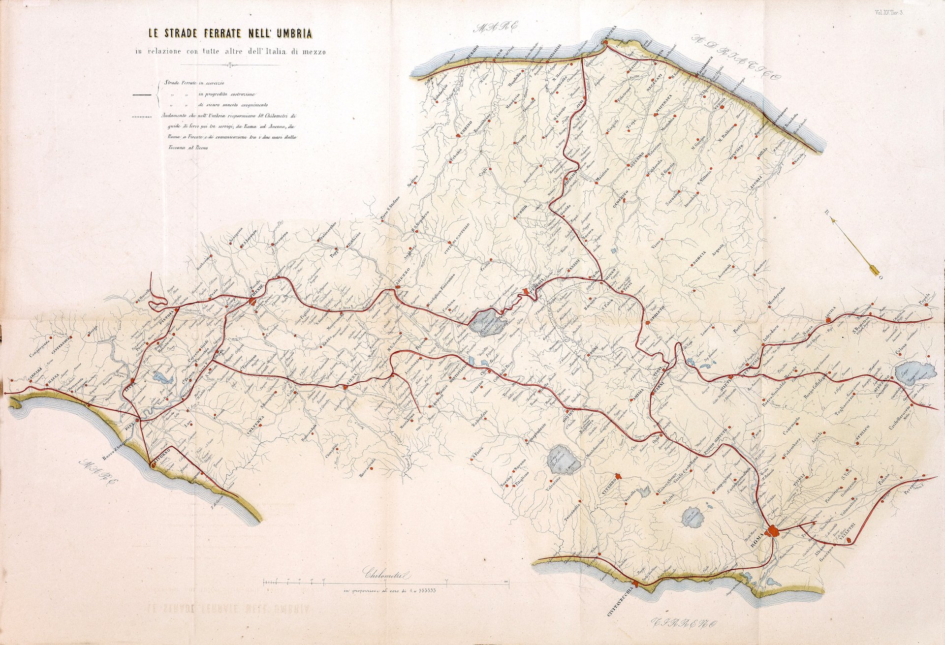 Litografia, mm 678x465, dipinta a mano. Interessante carta, rara, circoscritta alle zone limitrofe al corso della ferrovia umbra, ma anche del centro Italia, infatti raffigura la strada ferrata dal lago del Fucino a Pesaro a Carrara e Velletri. Sopra titolo e legenda, scala chilometrica in basso Perfettamente conservata. Traccia di pieghe editoriali. In alto riporta la nota “Vol. XV, Tav. 3”