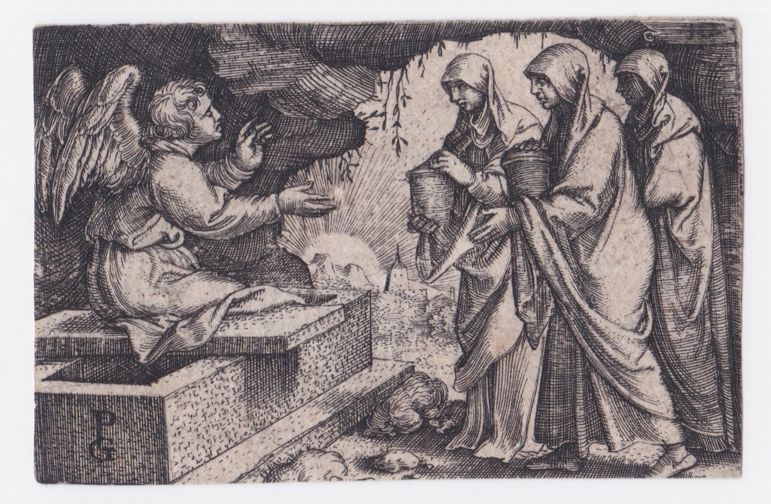 La piccola composizione appartine alla serie: La vita di Cristo. Realizzata tra il 1534 e il 1535 si compone di 26 lastre. Le Marie si recano di buon mattino al sepolcro con i vasi di unguenti e lo trovano aperto. Sgomente ascoltano da un angelo la notizia della Resurrezione di Cristo. Stato unico. In basso su una roccia inciso il numero 5 e a sinistra il monogramma PG.