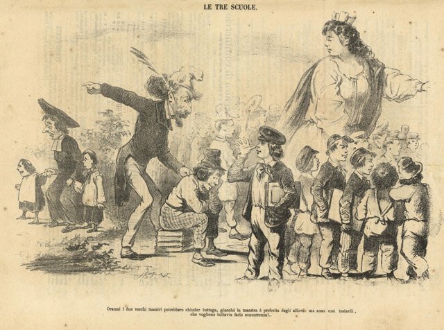 Oramai i due vecchi maestri potrebbero chiuder bottega, giacchè la maestra è preferita dagli allievi: ma sono così testardi, che vogliono tuttavia farle concorrenza!.La stampa è stata piegata per la spedizione e porta al retro, con inchiostro rosso, un timbro rotondo di 1 centesimo,testo al verso. Piccoli restauri alla piega centrale.