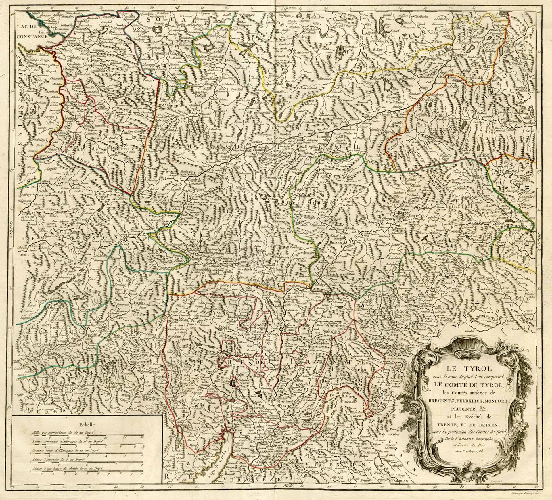 Le Tyrol sous le nom du quelle l'on comprend le Comté de Tyrol, les Comtés annèxes de Bregentz, Feldkirck, Monfort, Pludentz, & C. et les Evéchés de Trente, et de Brixen.