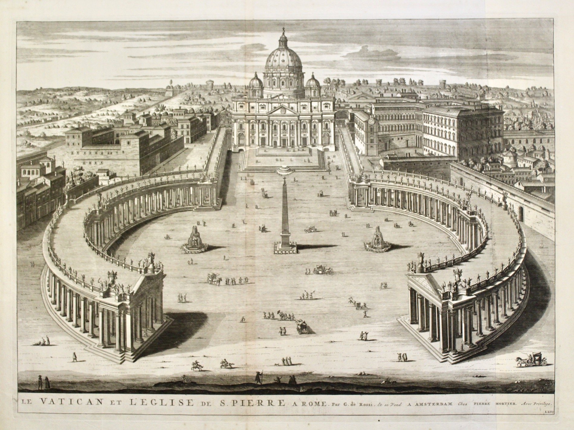 Incisione in rame di mm 490x540, originariamente opera di G. De Rossi. Fascinosa veduta a volo d'uccello di Piazza san Pietro con colonnato e Basilica sullo sfondo. Pierre Mortier (1661-1711) fu un editore assai attivo ad Amsterdam agli inizi del XVIII secolo: tra le sue principali fatiche si annovera la ristampa del "Theatrum Civitatum…Italiae" di Blaeu con l'aggiunta originale di un quarto volume, relativo a nord Italia e Toscana. La tavola proviene proprio da quest'opera. Buon esemplare con qualche minimo difetto restaurato e trascurabili mancanze marginali. <BR>
