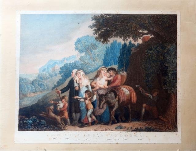 Paris, Chez Bance, 1800. Incisione in rame all'acquaforte stampata in colore, in parte alla maniera punteggiata (pointillé), cm 49 x 61 circa (il foglio). In basso a destra "Chaponier Sculp.", in basso a sinistra "I. K. Shervin Del.". Bella scena animata da grandi figure in primo piano e in magnifica coloritura a stampa, dove si esaltano i blu e gli azzurri e laddove va anche considerato che il primo Ottocento è il periodo pioneristico della sperimentazione a stampa di lastre a più colori. Applicata su sottostante cartone, foxing ai margini, buono e vivace l'inciso. .