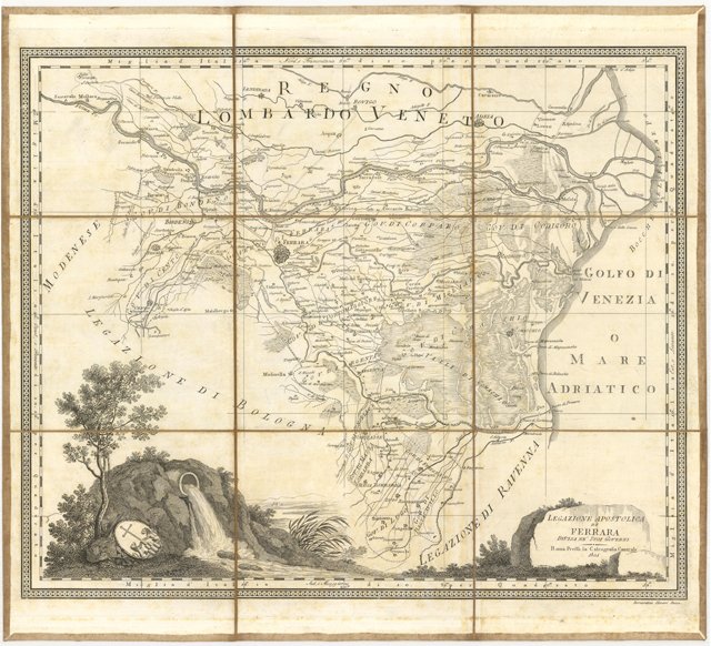 Carta geografica della Legazione di Ferrara montata su tela a stacchi. Dal punto di vista tecnico è tracciato il reticolato geografico con maglie rispondenti a 10' di latitudine per 10 ' di longitudine. Orografia a monticelli con tratteggio a luce obliqua, abitati rappresentati in pianta, strade e confini. La carta è arricchita da una cornice e da decorativo cartiglio in cui è riportato il titolo della stessa. Stampata a Roma presso la Calcografia Camerale. Nella porzione di territorio raffigurato si notano le città di Ferrara, Bondeno, Lendinara, Rovigo, Adria, Codigoro ed il tratto litorale che va dalle bocche del fiume Po' sino a Porto di Primaro.