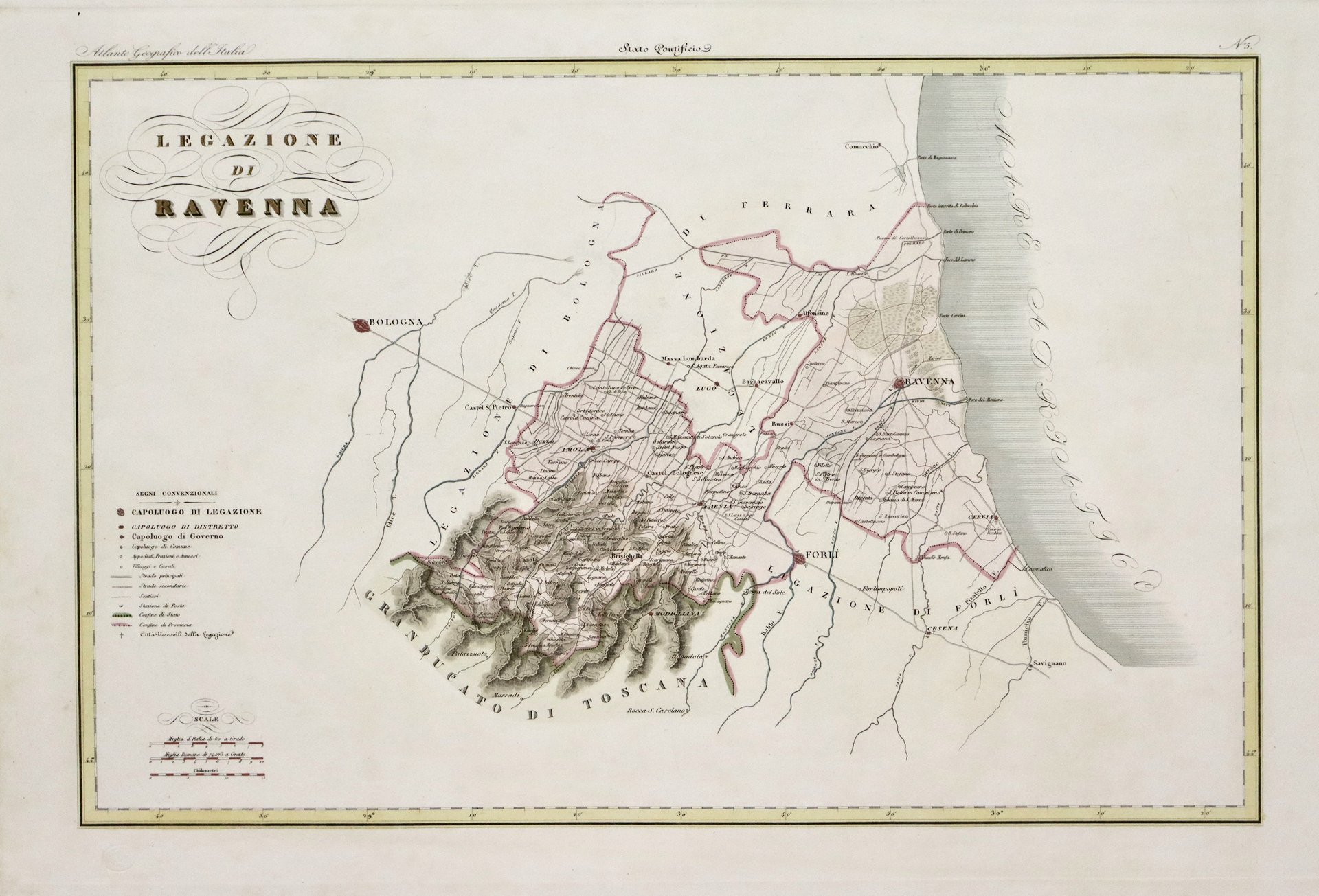 Incisione in rame, dipinta a mano, mm 340x522 (immagine) incisa da V. Stanghi su disegno di P. Manzoni. Attilio Zuccagni-Orlandini (1784-1872) fu un cartografo e geografo italiano. La sua opera principale è senza dubbio la Corografia fisica, storica e statistica dell'Italia e delle sue isole, cui l'incisione appartiene. La Corografia si compone di dodici tomi (senza contare i vari supplementi), stampati tra il 1833 e il 1845, ed è corredata da un atlante in due volumi e da numerose mappe geografiche e topografiche, nonché da tavole illustrative. <BR>Bell'esemplare.<BR>