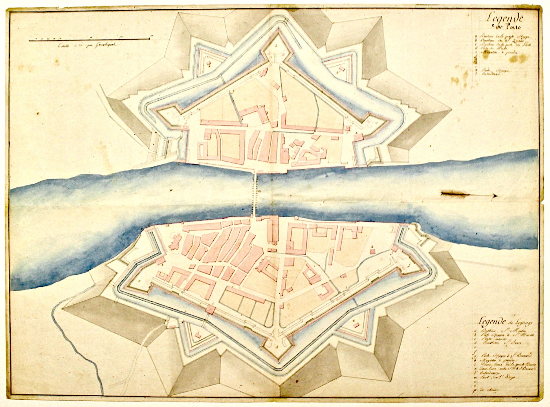 Rara pianta manoscritta policroma di grande formato, eseguita su carta vergellata con filigrana JHONIG & ZOONEN a sinistra e Giglio su scudo sormontato da corona a destra. Misura mm 490x670. La pianta mostra un notevole dettaglio tecnico, per cui è facile supporre un'origine militare del periodo napoleonico, e riporta due legende negli angoli di destra, relative a Porto (A-L) in alto e Legnago (A-P) in basso con riferimento soprattutto a porte, bastioni, magazzini. A sinistra in alto è riportata una scala metrica. Il materiale iconografico su Legnago è scarso numericamente e spesso raro anche se calcografico; una grande pianta manoscritta è da considerarsi di grandissima rarità e nella nostra pluridecennale attività non abbiamo mai registrato un simile pezzo da collezione. <BR>Il disegno è molto ben conservato, con una piega verticale ed una orizzontale centrale, e presenta minime finissime traforature e insignificanti difettini<BR>