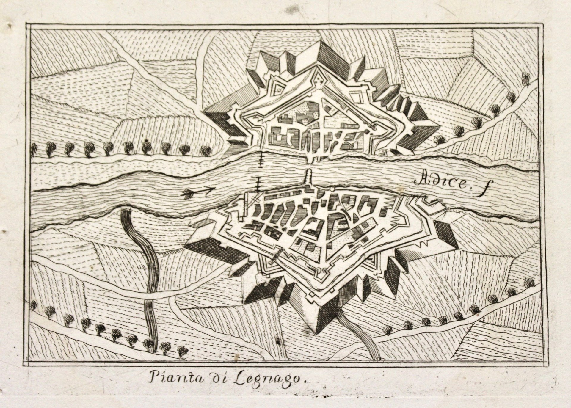 Incisione in rame, mm 110x153. Rarissima pianta della città che attribuiamo al Filosi per lo stile e la sua appartenenza ad una serie di piccole vedute di Verona, che riportavano la sua firma. Non abbiamo mai avuto questa stampa nella pluridecennale attività e non siamo riusciti a rintracciare bibliografie che la cataloghino. Ottimo esemplare, perfetto