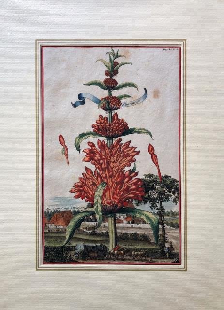 Tratta dall'opera di Johann Christoph Volkamer “Hesperides” (“Esperidi”) pubblicata a Norimberga intorno al 1710. Incisione in rame all'acquaforte, in recente ma in bella e vivace coloritura, cm 20,5 x 31 (alla lastra) più margini. Ottimo stato di conservazione. L'opera, in due volumi, consiste in una raccolta di tavole che raffigurano prevalentemente agrumi: limoni, lime, arance, bergamotti, pompelmi, ananas, melograni, ma anche noci di cocco, nelle loro varietà e forme, sia tipiche che esotiche, fluttuano come corpi celesti sopra le ville italiane, le campagne e i giardini, dando vita a un'opera originale e di gran fascino. L' apparato iconografico è di ricercata bellezza: le incisioni raffigurano frutti nella parte superiore; palazzi, ville, giardini e labirinti nella parte inferiore, con architetture che sono per lo più quelle del nord est d'Italia, ossia della provincia di Padova e di Verona. Johann Christoph Volkamer (1644 - 1720) figlio di un medico e botanico dedito alla progettazione di giardini, fu un intraprendente commerciante di Norimberga che ereditò dal padre la profonda passione per la botanica. Intorno al 1660 visitò numerosi parchi e giardini d' Italia, da cui nacque il suo particolare interesse per l’universo degli agrumi. Rientrato in Germania costruì il proprio giardino, dove instaurò numerose piante e da cui trasse ispirazione per realizzare i suoi numerosi schizzi, che sarebbero poi andati a comporre, fra il 1708 e il 1710, la sua opera più importante, il “Nürbergisches Hesperides oder gründliche Beschreibung der edlen Citronat, Citronen - und Pomeranzen – Früchte.”. In questa splendida raccolta (di evidente derivazione dalle “Hesperides, sive, De malorum aureorum cultura”, di Giovanni Battista Ferrari, opera che appunto celebrava gli agrumi) il Volckamer riuscì a coniugare suggestioni storiche e letterarie con una puntuale ricerca scientifica, intrecciando mirabilmente i frutti della natura a splendidi paesaggi e architetture. (Cfr. Blunt: “Delightful views of the gardens and palaces of Germany, Austria and Italy”). .