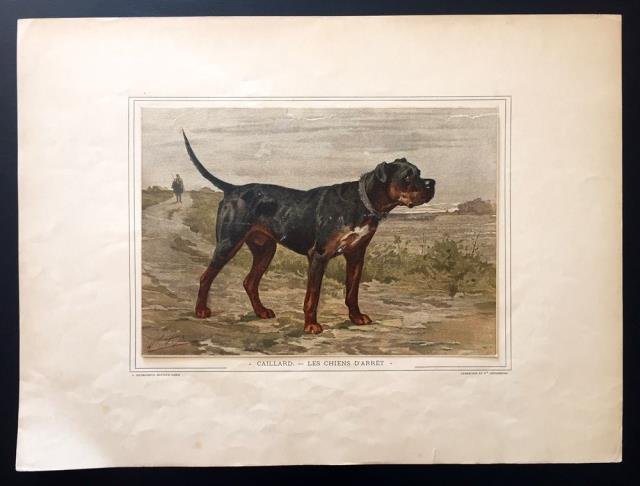Rothschild Éditeur, Lemercier et C.ie Imprimeurs, Paris 1890. Cromolitografia, cm 19,5 x 28 circa (la parte figurata) più margini. Sono raffigurati i cani “cani da ferma”, quelli con forte istinto venatorio e adatti a inseguire le prede. Possibili difetti ma nell'insieme buono stato.