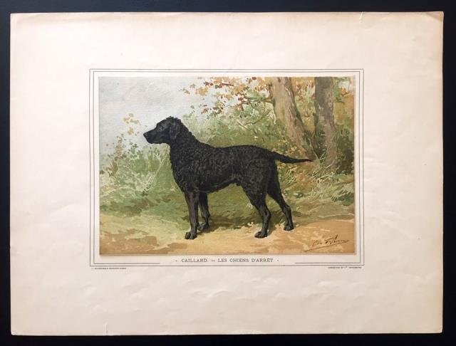 Rothschild Éditeur, Lemercier et C.ie Imprimeurs, Paris 1890. Cromolitografia, cm 19,5 x 28 circa (la parte figurata) più margini. Sono raffigurati i cani “cani da ferma”, quelli con forte istinto venatorio e adatti a inseguire le prede. Possibili difetti ma nell'insieme buono stato.