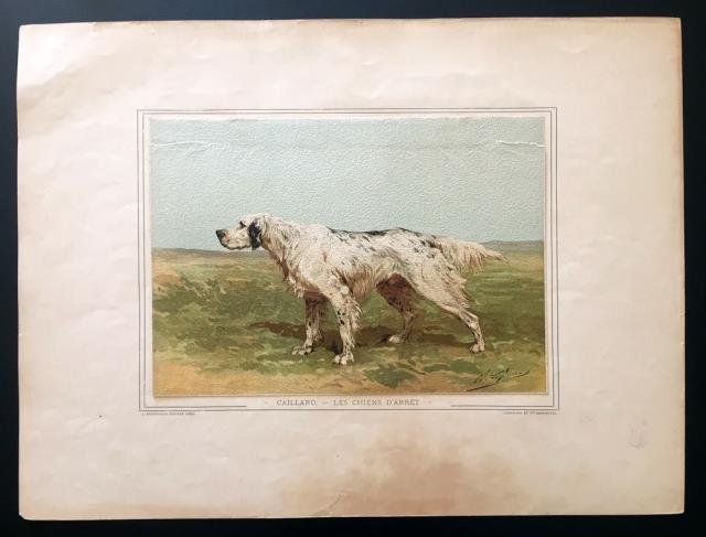 Rothschild Éditeur, Lemercier et C.ie Imprimeurs, Paris 1890. Cromolitografia, cm 19,5 x 28 circa (la parte figurata) più margini. Sono raffigurati i cani “cani da ferma”, quelli con forte istinto venatorio e adatti a inseguire le prede. Possibili difetti ma nell'insieme buono stato.