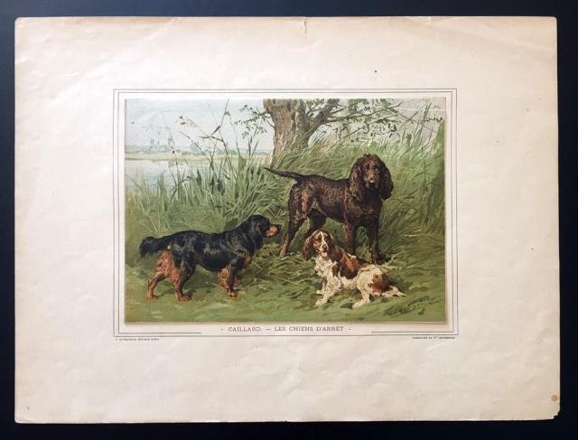 Rothschild Éditeur, Lemercier et C.ie Imprimeurs, Paris 1890. Cromolitografia, cm 19,5 x 28 circa (la parte figurata) più margini. Sono raffigurati i cani “cani da ferma”, quelli con forte istinto venatorio e adatti a inseguire le prede. Possibili difetti ma nell'insieme buono stato.