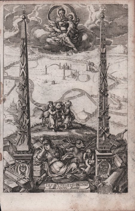 Allegoria di Roma, rappresentata sullo sfondo. In primo piano la figura di Minerva; in alto la Vergine che protegge la città. Frontespizio della rara guida francese Les curiositez de l'une et de l'autre Rome, ou: Traité des plus augustes temples et autres principaux lieux saints de Rome chrestienne di Nicolas de Bralion, stampata a Parigi nel 1655. Nicolas de Bralion (1600-1672) è stato un oratoriano e scrittore ecclesiastico francese che ha influenzato la diffusione di diverse idee italiane in Francia. De Bralion entrò a far parte dell'Oratorio di Parigi nel 1619 e pubblicò una serie di libri storici e religiosi. Acquaforte, in ottimo stato di conservazione. Allegory of Rome, depicted in the background. In the foreground is the figure of Minerva; above is the Virgin protecting the city. Title page of the rare French guide Les curiositez de l'une et de l'autre Rome, ou: Traité des plus augustes temples et autres principaux lieux saints de Rome chrestienne by Nicolas de Bralion, printed in Paris in 1655. Nicolas de Bralion (1600–1672) was a French oratorian and ecclesiastical writer who was influential on bringing various Italian ideas into France. De Bralion joined the Paris Oratory in 1619 and published a number of historical and religious books. Etching, very good condition. Cfr.