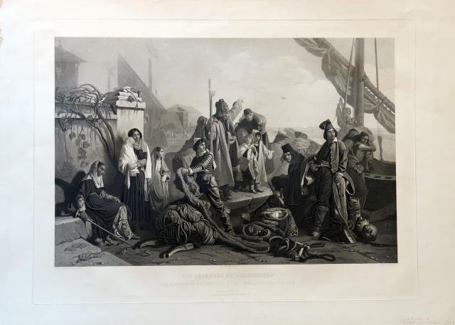 Paris, Goupil, metà XIX secolo. Incisione su acciaio, b/n, cm 43,5 x 58,5 (alla lastra). Bella scena di costume animata da grandi fgure di pescatori e di popolane del Mare Adriatico della zona di Romagna. Ottimo stato di conservazione.