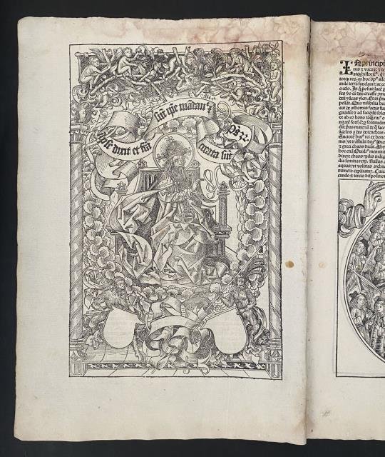 Dal “Liber Chronicarum Nurembergensi”, Norimberga, 1493. Foglio I. Xilografia stampata su pagina singola, b/n, cm 32,5 x 47,5 circa (il foglio). Al recto grande capolettera con la lettera C decorato e colorato d'epoca; al verso è incisa una scena a pagina intera in cui si raffigura Dio in trono sovrastato da bambini e con ai piedi due luciferi,il tutto riccamente decorato da colonne, volute e festoni con titolo entro cartiglio a svolazzo. Foglio interessato da leggera e contenuta presenza rosso - violacea, il cosiddetto fungo rosso, ma al solo margine superiore, peraltro ben impresso e in buono stato di conservazione.