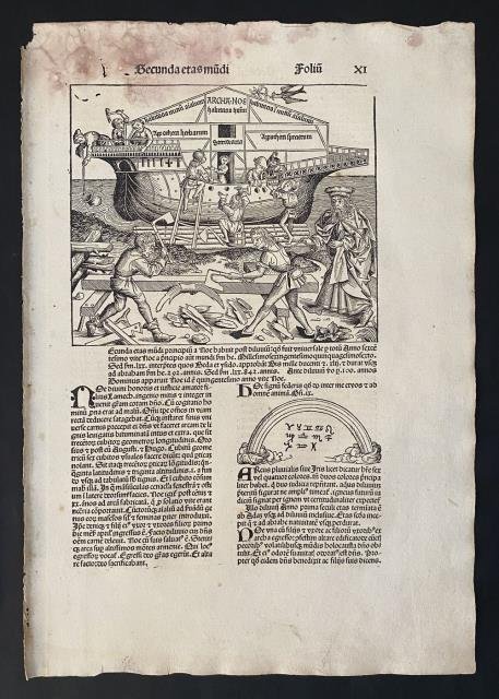 Dal “Liber Chronicarum Nurembergensi”, Norimberga, 1493. Foglio XI. Xilografia stampata su pagina singola, b/n, cm 32,5 x 47,5 circa (il foglio). Al recto la parte superiore del foglio è occupata dal rettangolo che narra la costruzione dell'arca; più sotto alcuni simboli ebraici o islamici; al verso solo testo latino. L'arca di Noè, nel racconto biblico, fu una grande imbarcazione costruita su indicazione divina da Noè, per sfuggire al diluvio universale e per preservare la specie umana e gli altri esseri viventi. Foglio interessato da leggera e contenuta presenza rosso - violacea, il cosiddetto fungo rosso, ma al solo margine superiore, peraltro ben impresso e in buono stato di conservazione. .