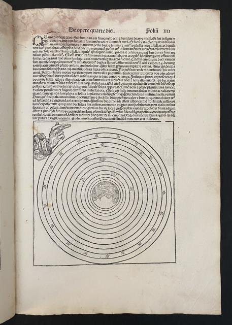 Dal “Liber Chronicarum Nurembergensi”, Norimberga, 1493. Foglio IIII. Xilografia stampata su pagina singola, b/n, cm 32,5 x 47,5 circa (il foglio). Al recto una stretta serie di cerchi celesti cosparsi di stelle, compare la luna e nell'epicentro la terra; al verso la creazione della natura con la presenza di acqua, pesci, e uccelli sull'albero. Foglio interessato da leggera e contenuta presenza rosso - violacea, il cosiddetto fungo rosso, ma al solo margine superiore, peraltro ben impresso e in buono stato di conservazione.