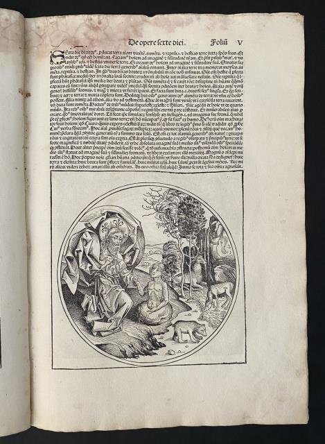 Dal “Liber Chronicarum Nurembergensi”, Norimberga, 1493. Foglio V. Xilografia stampata su pagina singola, b/n, cm 32,5 x 47,5 circa (il foglio). Al recto è raffigurato il sesto giorno della creazione. Dopo aver creato il mondo animale Dio crea Adamo ed è raffigurato nell'atto della benedizione dell'uomo dopo la creazione. Al verso del foglio una ancor più grande silografia raffigurante l'universo geocentrico (la terra al centro) sovrastato da Dio in trono con gli angeli; nei quattro angoli soffiano i venti. Foglio interessato da leggera e contenuta presenza rosso - violacea, il cosiddetto fungo rosso, ma al solo margine superiore, peraltro ben impresso e in buono stato di conservazione. .