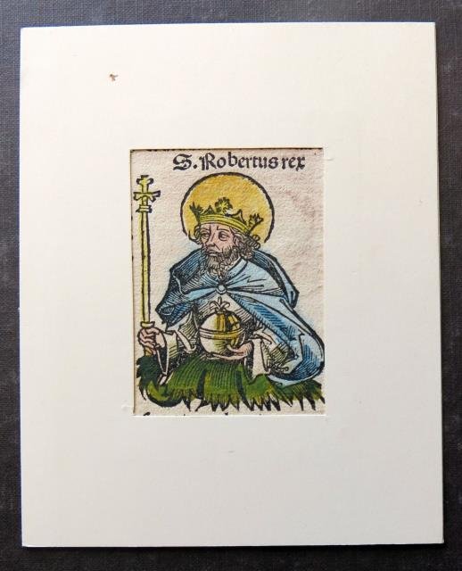 Anton Koberger, Norimberga, 1493. Dal “Liber Chronicarum Nurembergensi”, xilografia stampata su carta forte, colorato a mano il fronte e lasciato in b/n il verso del foglio, cm 8,5 x 10 (il foglio), testo latino e immagini al recto (San Roberto Re). Frammento con lieve fioritura ma ben colorato e conservato. .