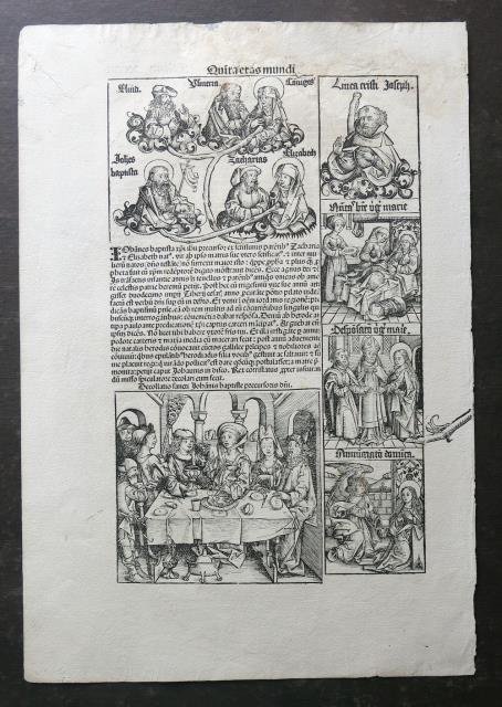 Anton Koberger, Norimberga, 1493. Dal “Liber Chronicarum Nurembergensi”, xilografia stampata su carta forte, b/n, cm 33 x 48 (il foglio), testo latino e immagini al recto e al verso (breve albero genealogico, Scene con la vita di Maria, nel riquadro Decollazione di San Giovanni Battista). Difetti del tempo al margine superiore, altrimenti pagina molto ben conservata.