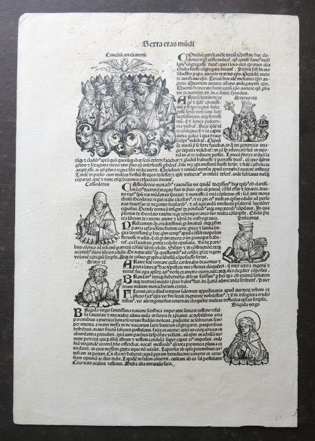 Anton Koberger, Norimberga, 1493. Dal “Liber Chronicarum Nurembergensi”, xilografia stampata su carta forte, b/n, cm 33 x 47,5 (il foglio), testo latino e immagini al recto e al verso (Concilio Aurinelianense, re, imperatori, pontefici, santi e filosofi). Difetti del tempo al margine superiore, altrimenti pagina ben conservata.